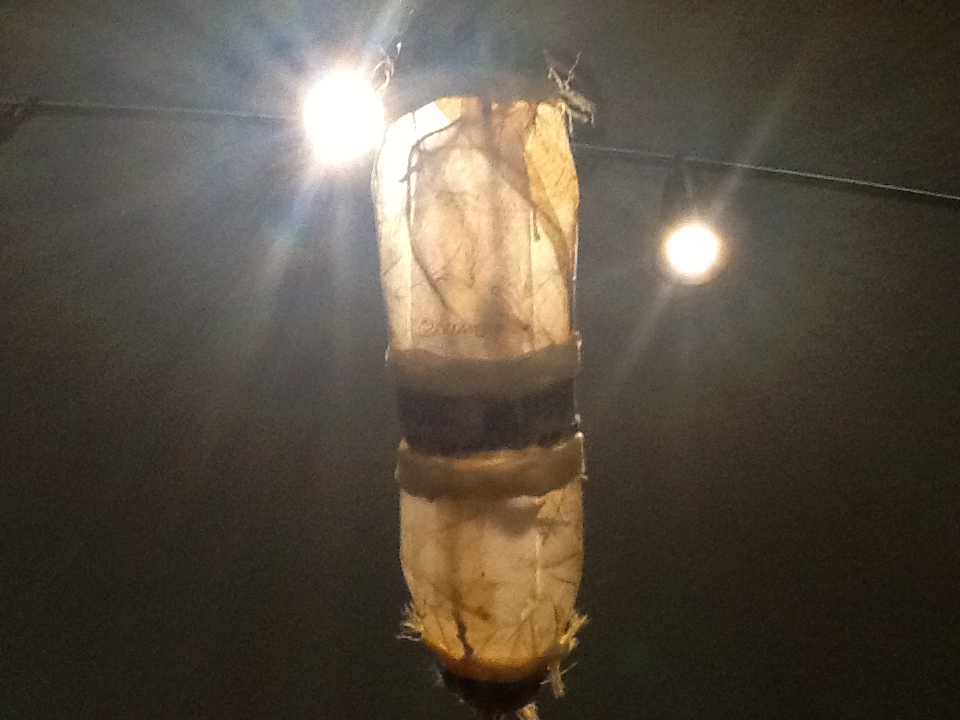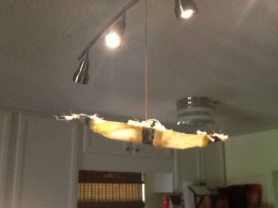 The Spirit Boat now hangs in our kitchen, under ceiling lights can be dimmed. It’s a lovely, warm, and comforting sight, especially when the lights are low. Given the openness of our floor plan, we have many vantage points for viewing the boat, watching it sway with the currents of a mild breeze or rock and spin when we turn on the ceiling fan.