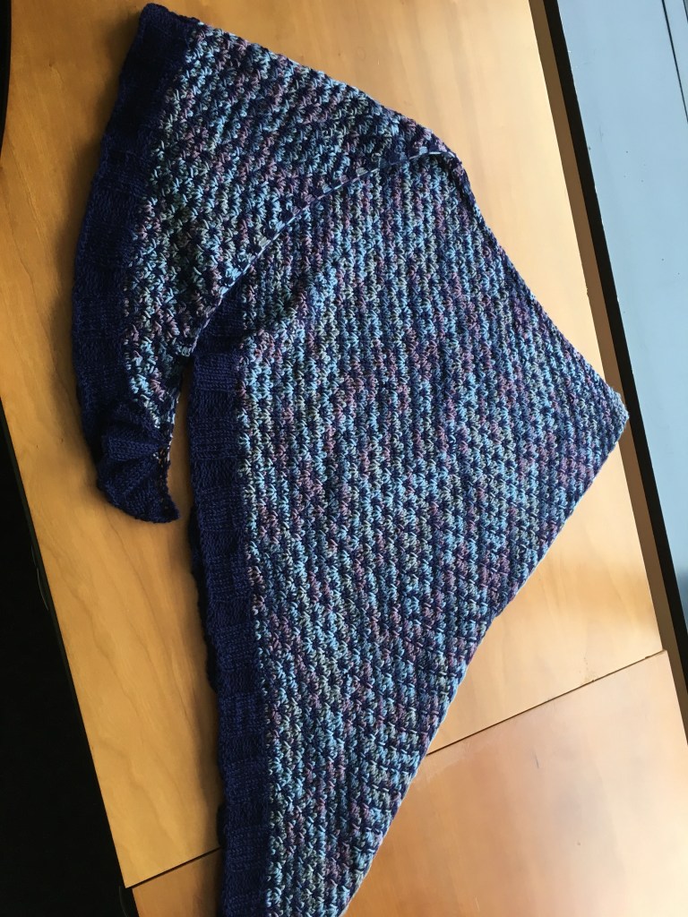 This shawl requires two different colors of yarn, but in the pattern, the colors are both solid. I had originally intended to knit a different shawl but the pattern and I weren’t getting along so I reverted to this one. It is one of my favorite shawl patterns, but the yarns deviated from what the pattern requires. So I was a bit of a nervous Nellie while knitting, worried that it wouldn’t look very nice at the end.