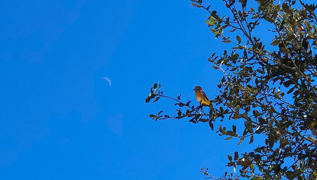 I am grateful to this bluebird for positioning himself so close to the sliver of moon and then holding his pose long enough for me to get a good photo. (This photo is a cropped enhancement courtesy of my husband.)