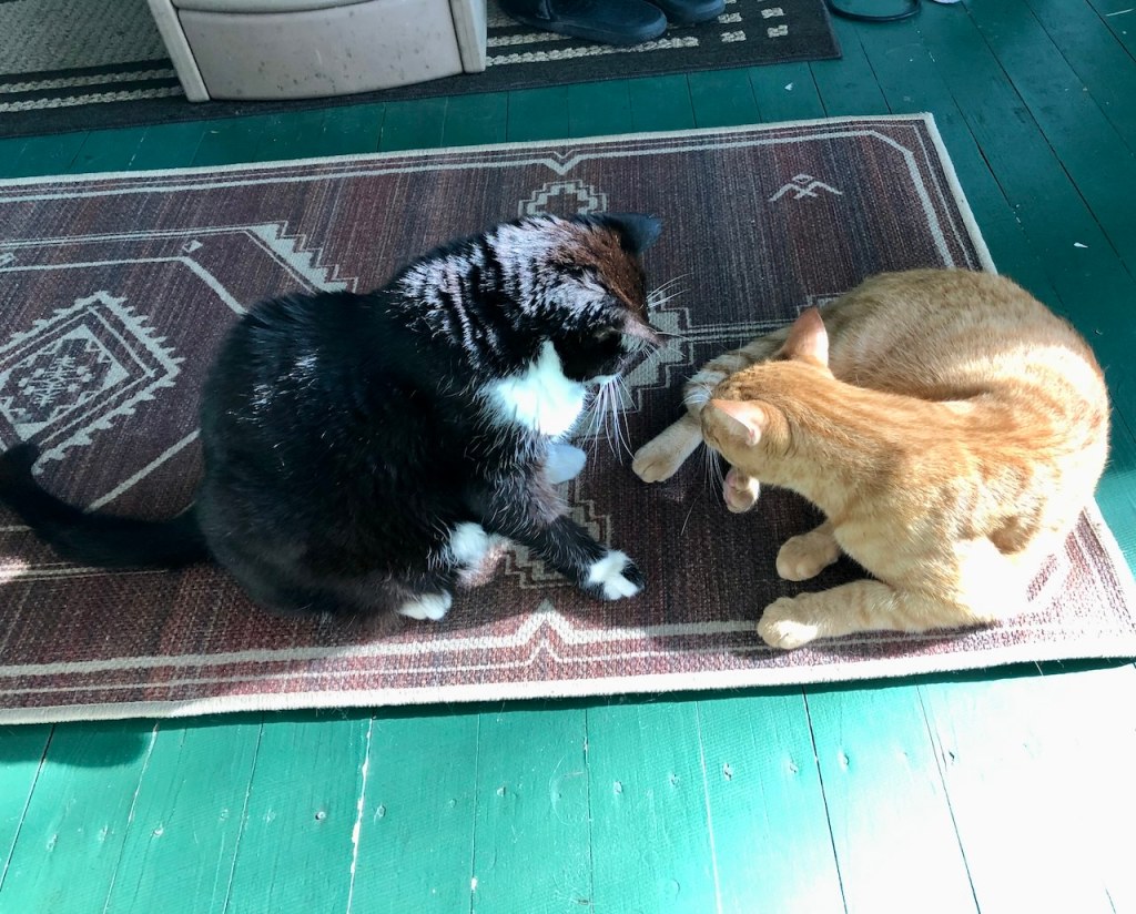 Meanwhile, our oldest cat Maxine has a drug-resistant UTI. Rather than put her on a regimen of twice daily injections that could last months without a guarantee of effectiveness, our vet recommends monitoring her kidney enzymes for now. Maxine is currently at Stage 3 kidney disease, but she has a good appetite, drinks water, and pees and poops normally. She sleeps a lot but when she’s awake, she’s alert. Still, at times there’s a sense of her health careening out of control.
