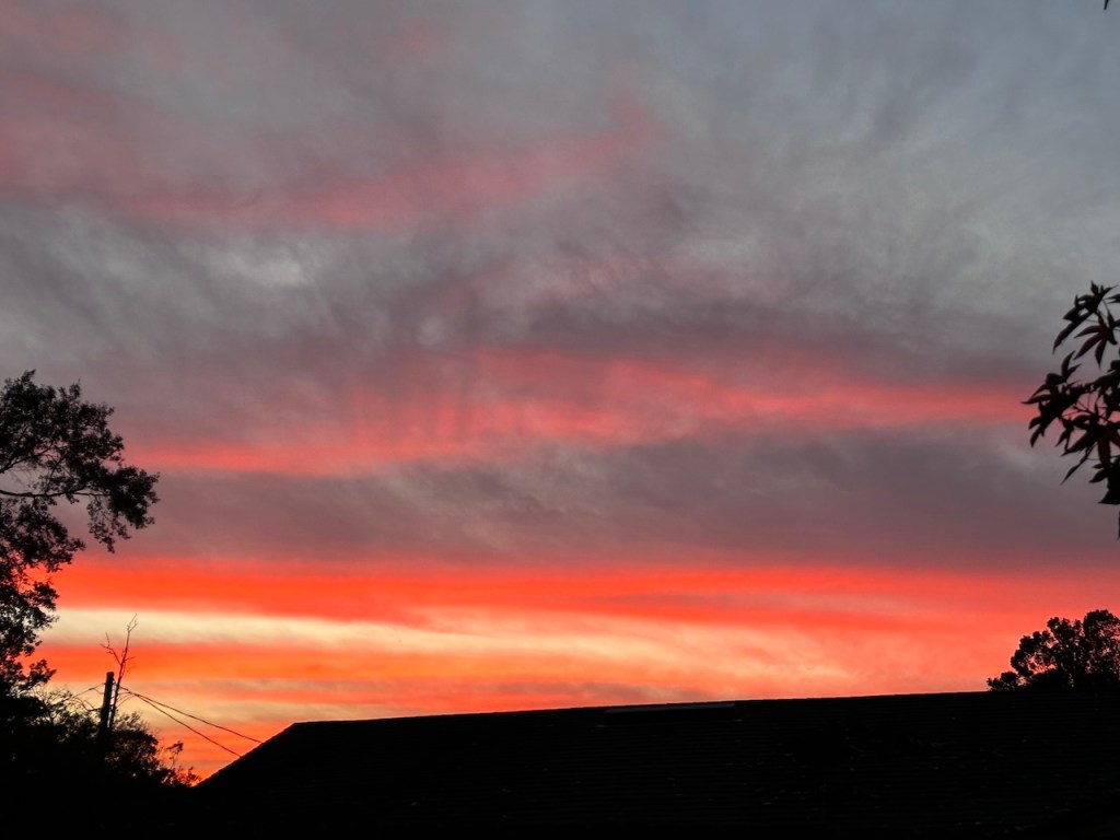 Before we set the clocks back an hour, my husband and I enjoyed long evenings on our patio, watching the light turn golden before heading back into our house for dinner. Now it’s a bit of a scramble as I like to prep for dinner ahead of time, before we relax on the patio. One evening I was running late. I was in the middle of prepping for dinner when my husband remarked that it looked like we might have a nice sunset. I thought I would shrug it off (surely, there’ll be more sunsets to enjoy) until he said, “Honey, you have to see this!” As quickly as possible, I put everything in the frig or the microwave for safe keeping (i.e., away from Wendy and Raji) and hurried outside only to have to run back inside to get my phone. He was right. I had to see this.