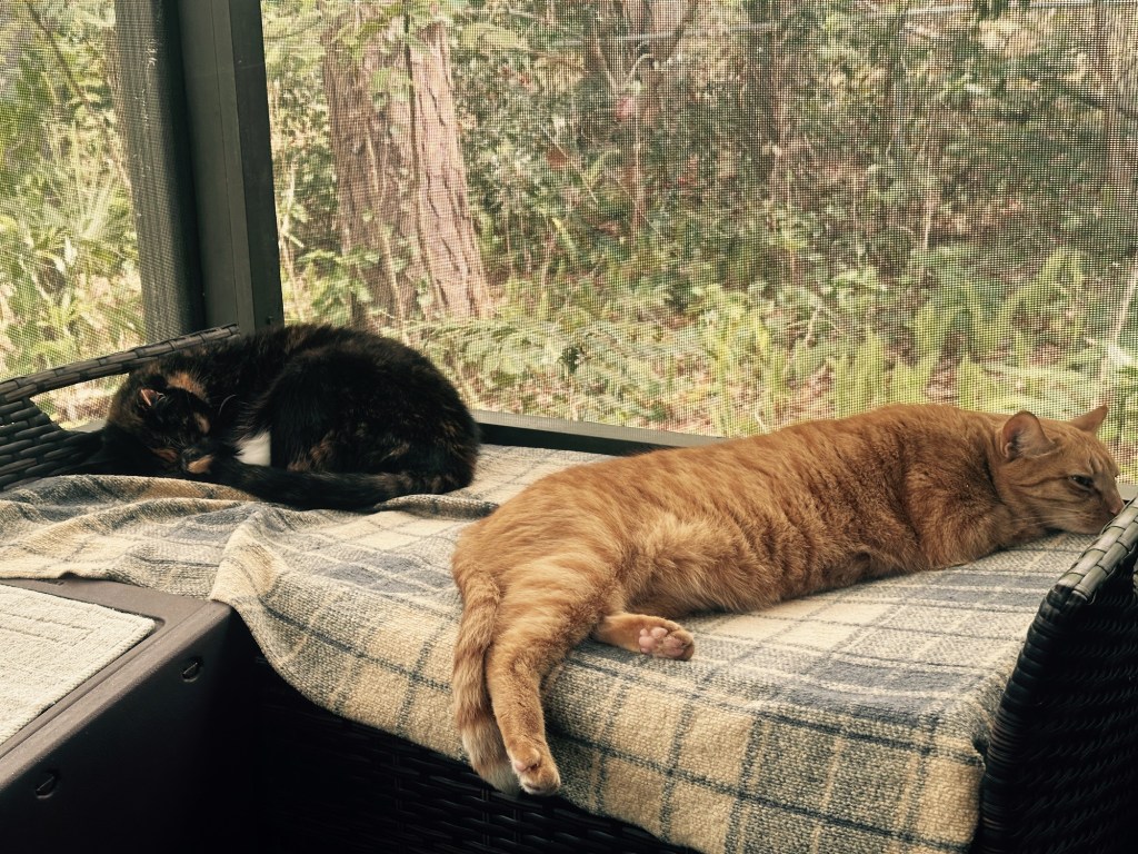 Thank you for reading! Your reward is a two-fer, something we don’t see very often in our household: Wendy and Raji sleeping (more or less) on the same bench. [Note that Raji likes to stretch out while Wendy makes herself small by curling into ball.]