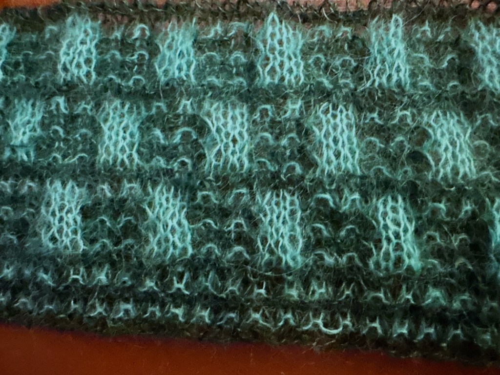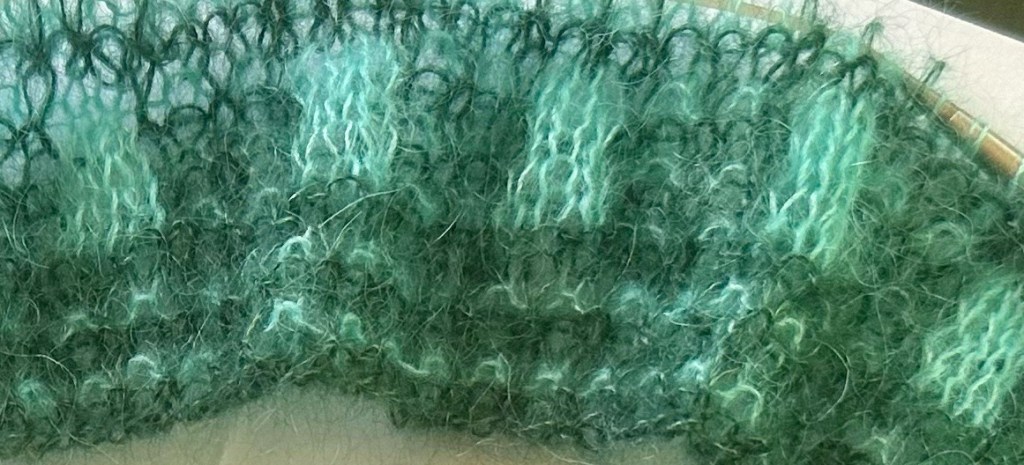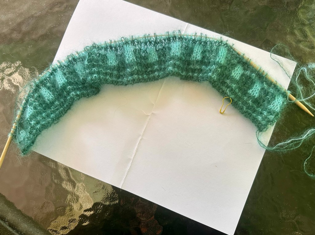 As you can see from the two photos above, several hours of knitting didn’t get me very far. I consider myself a fast knitter, but the yarn is quite fuzzy and thin. I need to knit slowly otherwise I’ll be dropping stitches.