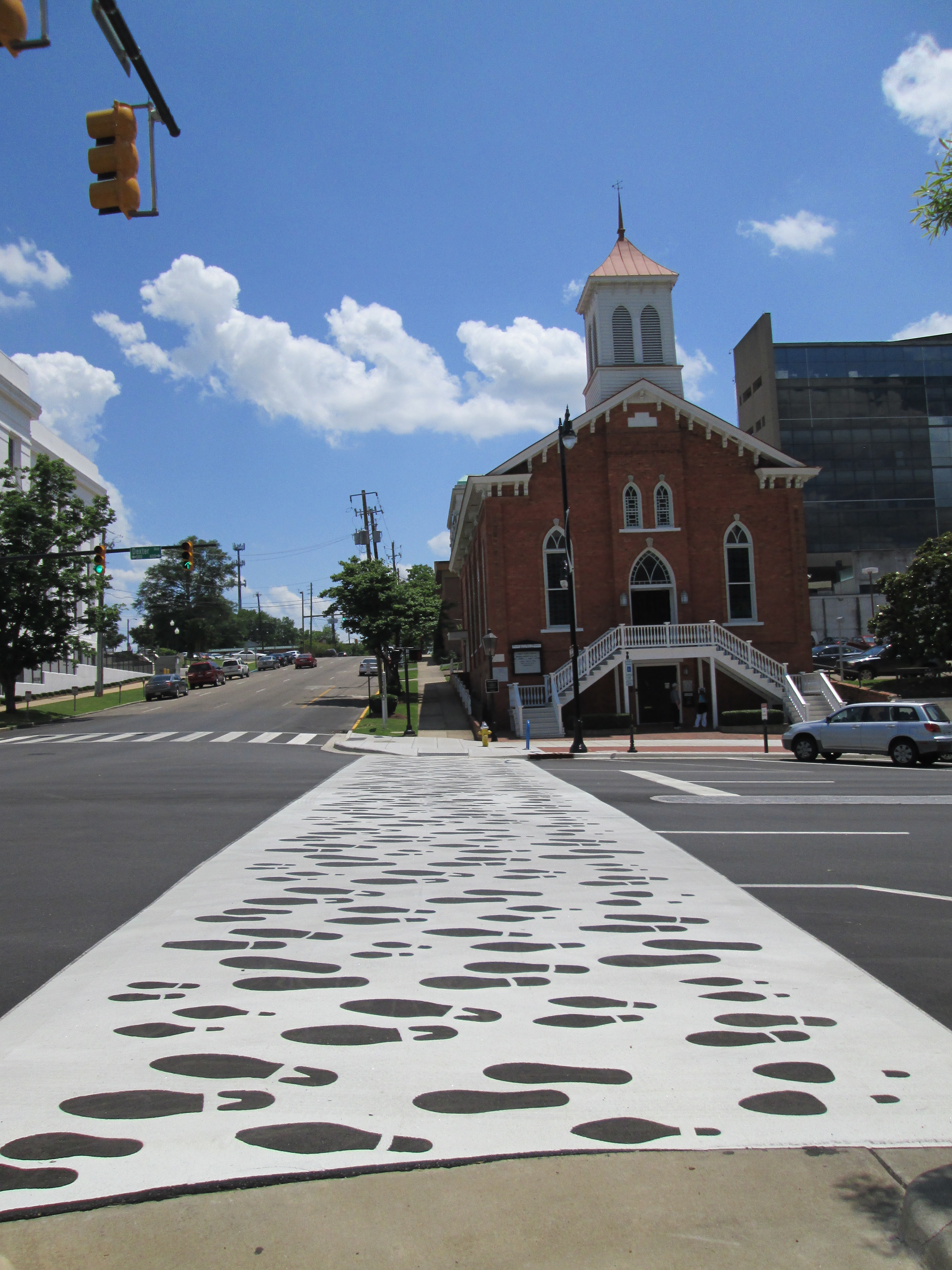And the strangely moving sight of shoe prints, all kinds, all sizes, stretching from the Civil Rights marker above, across Dexter Avenue, to the Dexter Avenue Baptist Church.