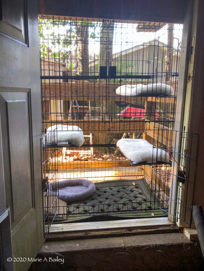 Raji has inspected every possible flaw in this setup, searching for any gap big enough to squeeze through, and giving us a piece of his mind while he does it. We’ve bolted, strapped, and twist-tied the pen in place, and secured wood panels where a kitty’s head might stick through. We were not only afraid of Raji getting away, but of him getting stuck. So this is a daytime playpen, to be used only when we are up and about and available to check on him frequently.