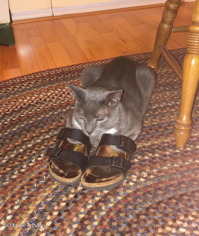 For now our three indoor kids are in denial. They do hear Raji chattering away in the garage, but pretend not to. Their ears, however, give them away. In the meantime, Junior still claims my sandals.