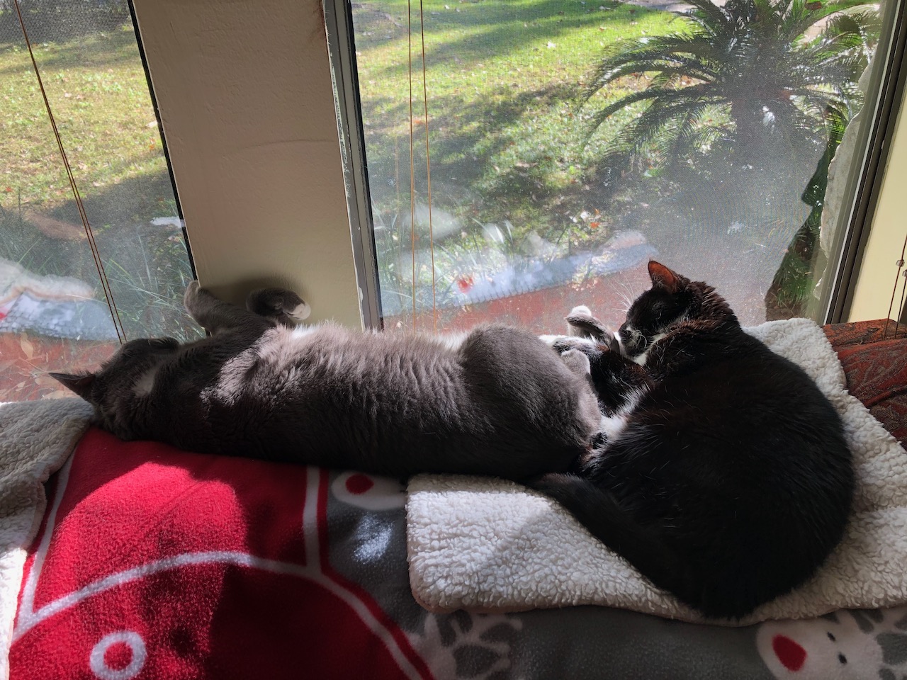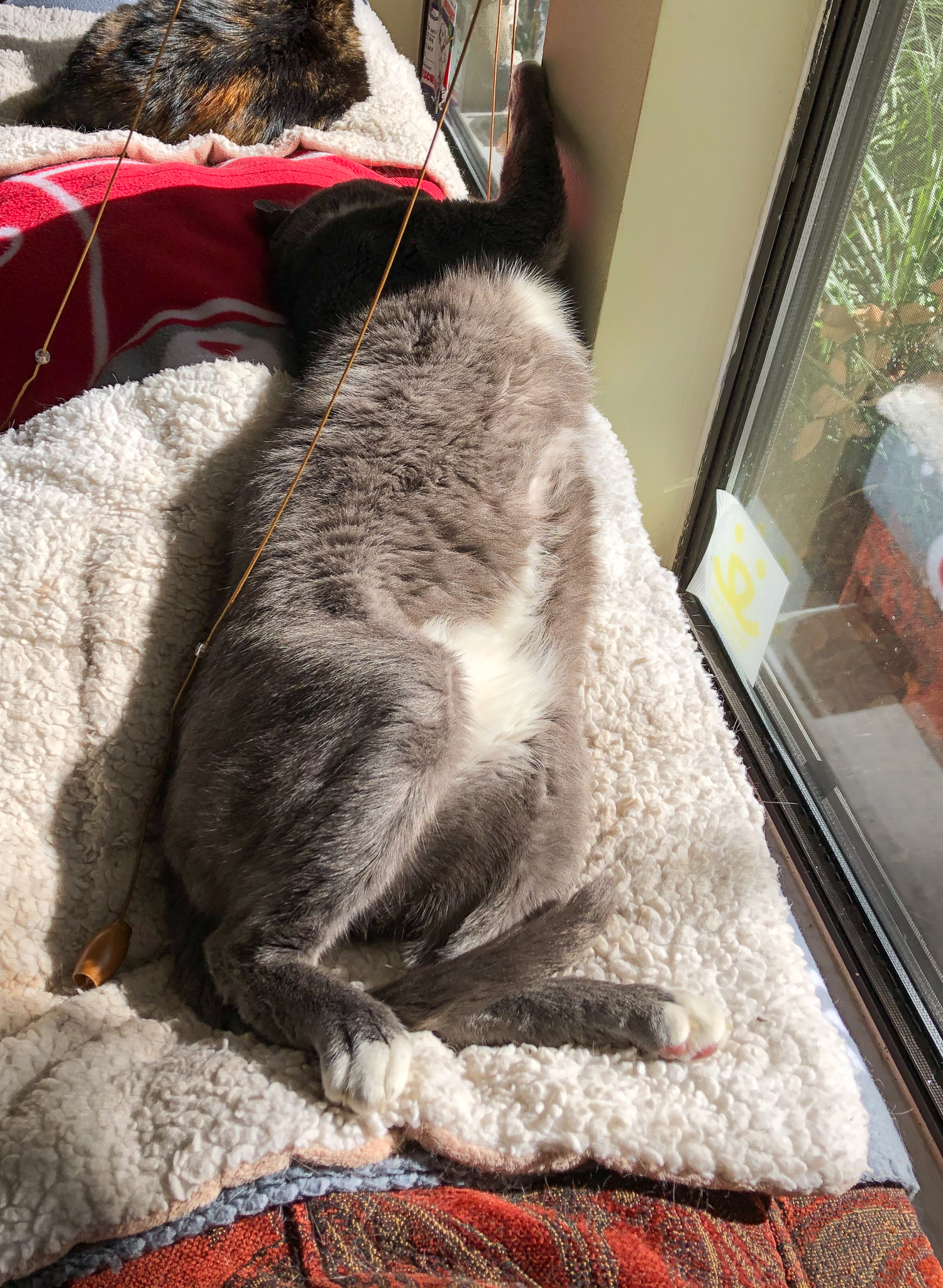 You only see Maxine tolerating Junior’s butt in her face when the temperatures start to drop and she’ll take any body heat she can find. Junior was soaking up the sun, silly boy. If you look really close, you can see that Maxine actually has a paw draped over Junior’s feet. Like children, they are so adorable when they are sleeping.