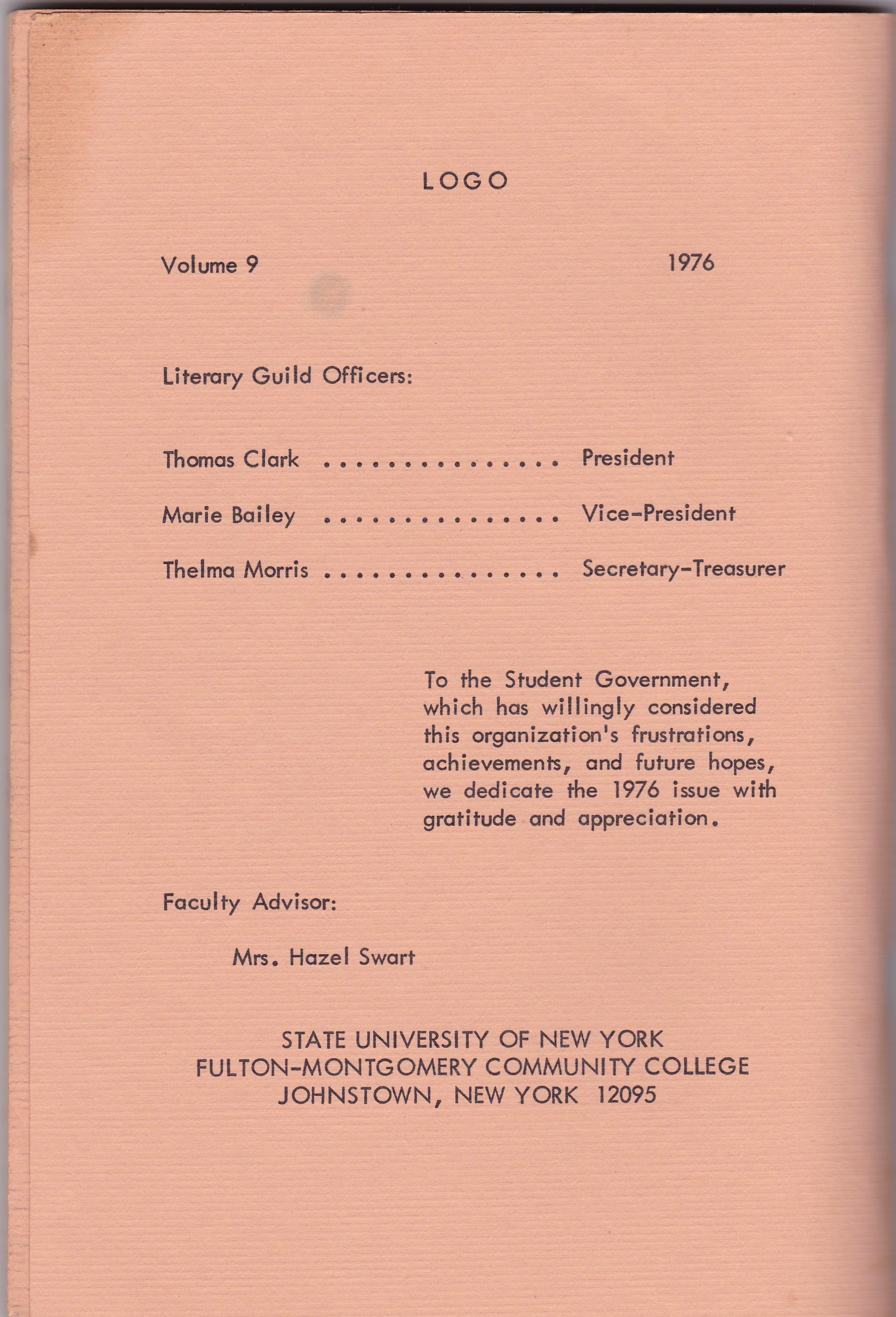 Well, here I go again, and this time a little further back in time. 1976. Spring semester at the community college I was attending. I had joined a literary guild the year before, and every year we published one or two volumes of a journal.
