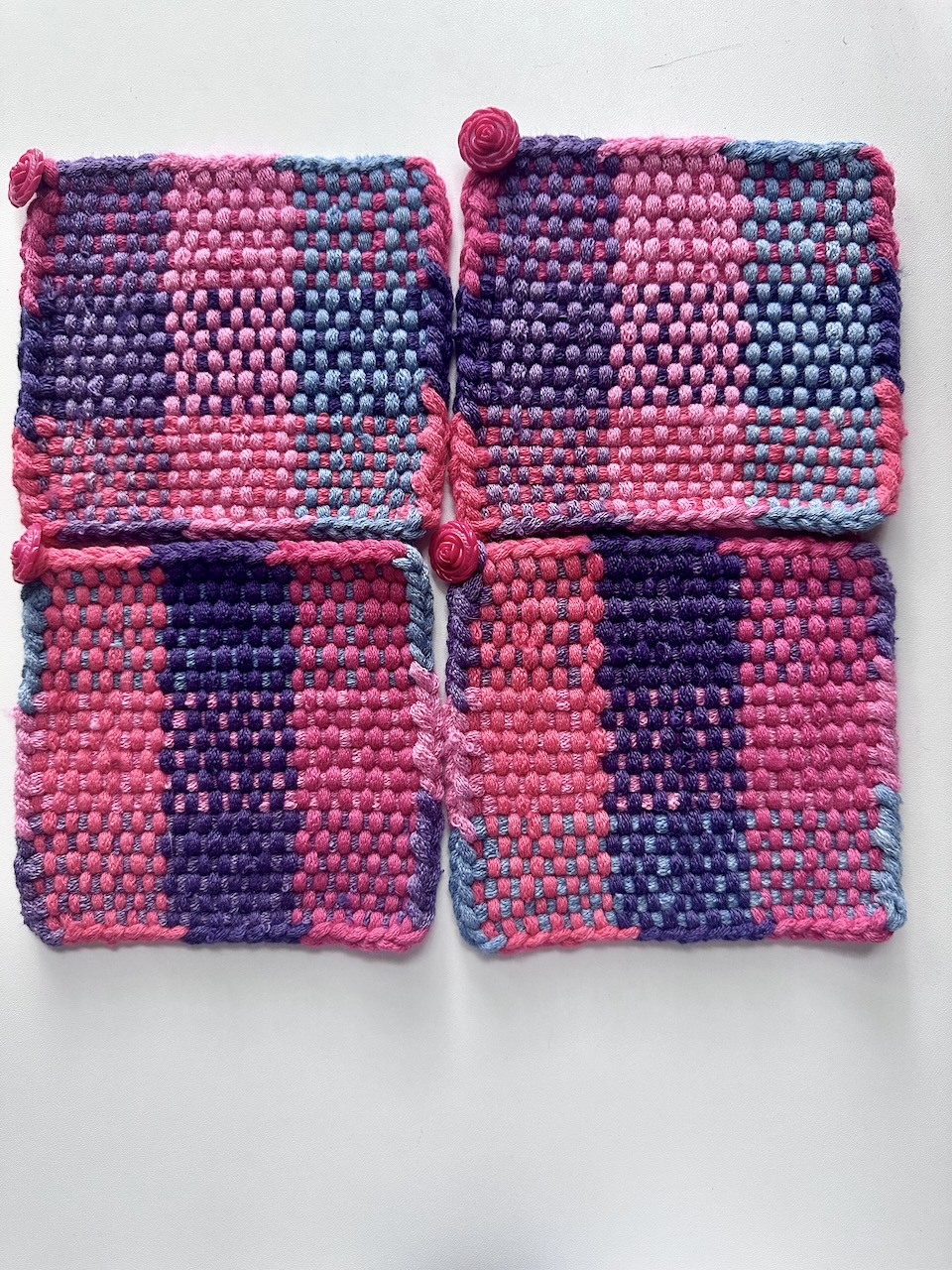 Four mug rugs in color combination of reds, pinks, blues, and purples.