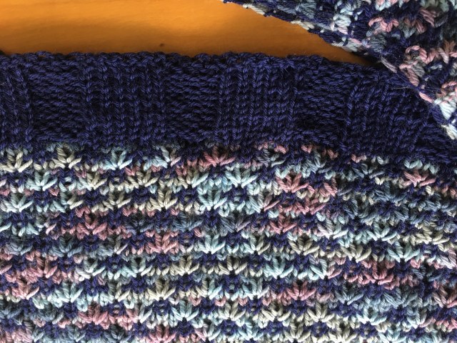 This shawl requires two different colors of yarn, but in the pattern, the colors are both solid. I had originally intended to knit a different shawl but the pattern and I weren’t getting along so I reverted to this one. It is one of my favorite shawl patterns, but the yarns deviated from what the pattern requires. So I was a bit of a nervous Nellie while knitting, worried that it wouldn’t look very nice at the end.