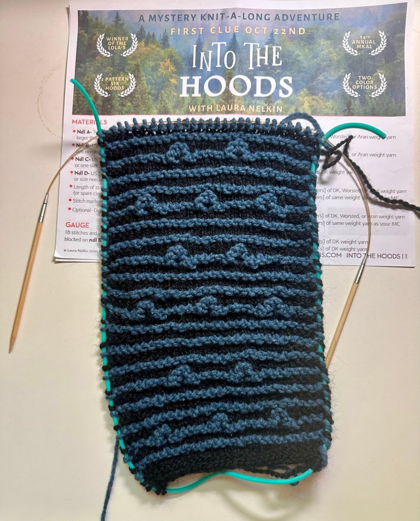 This is my first MKAL. We have a choice of six hoods to knit in either one color or two colors. Sight unseen and pattern unknown, I chose the two-color hooded scarf. For four weeks, once a week, Laura provides a clue to the project’s pattern. I don’t know what I’m knitting until Laura provides that part of the pattern. That’s the mystery. It really messes with my comfort zone, and I think that’s a good thing.