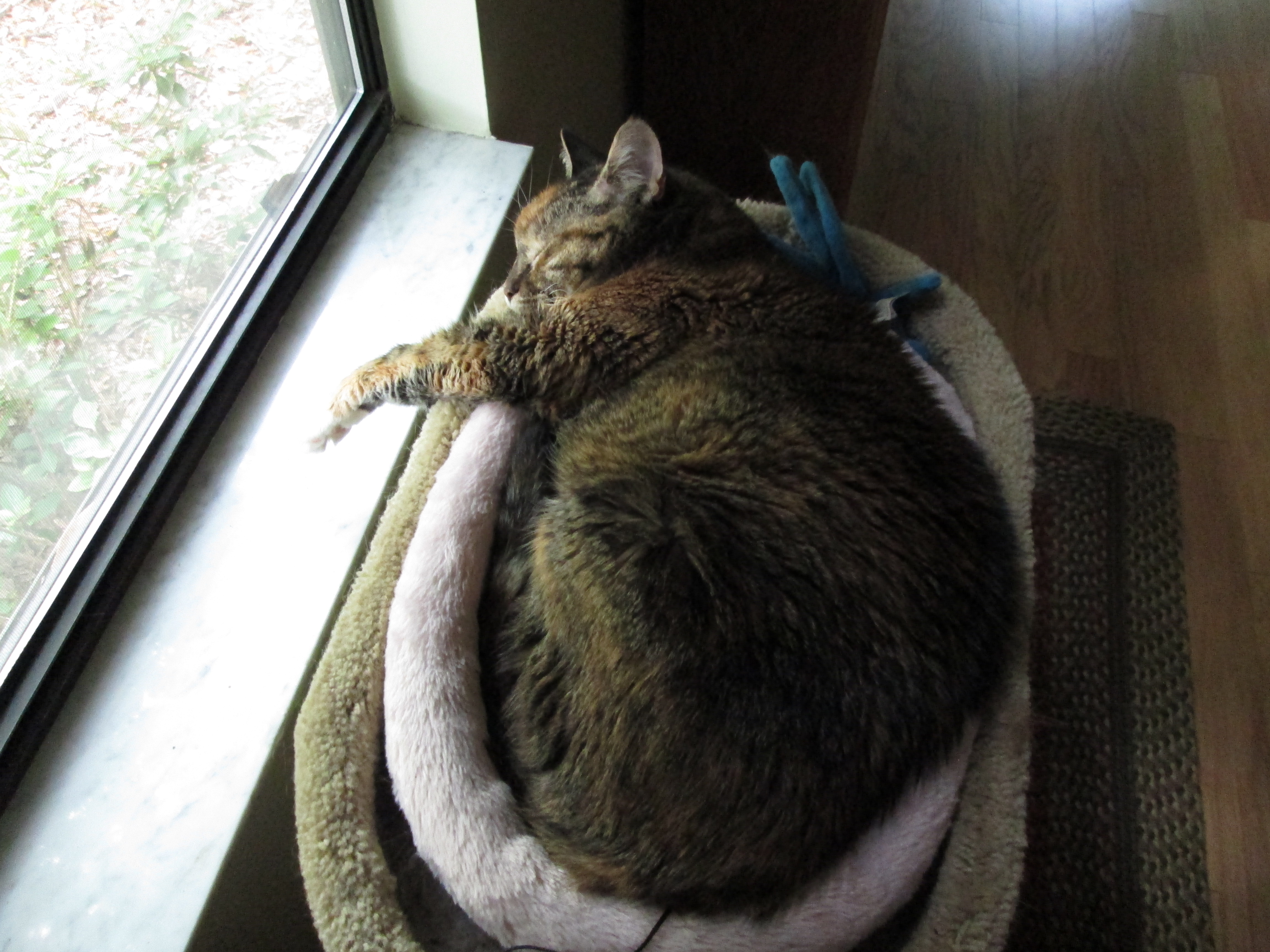 Okay, she’s not looking too spunky here, but this is the first morning in a week that she’s felt well enough to walk all the way from the back of the house to the front, climb up on the couch (with a little help from moi), and then take a nap in front of the window. And I have the pleasure of giving her a cocktail of drugs twice a day: her usual methimazole (for hyperthyroidism) and Pepcid (for her tummy; I don’t know that it helps but they say it doesn’t hurt); in addition, an anti-nausea pill once a day; appetite stimulant every three days; a liquid medication for colitis; and a food supplement similar to Activa. Fortunately, Luisa is very good about taking pills and even having a syringe of cold liquid splashed at the back of her throat. We are not assuming that she’s out of danger yet. I mean, she’s at least 20 (my husband argues that she’s closer to 22) and her body is shutting down. We’re just trying to slow the process and make her comfortable. And right now, our efforts are paying off :)
