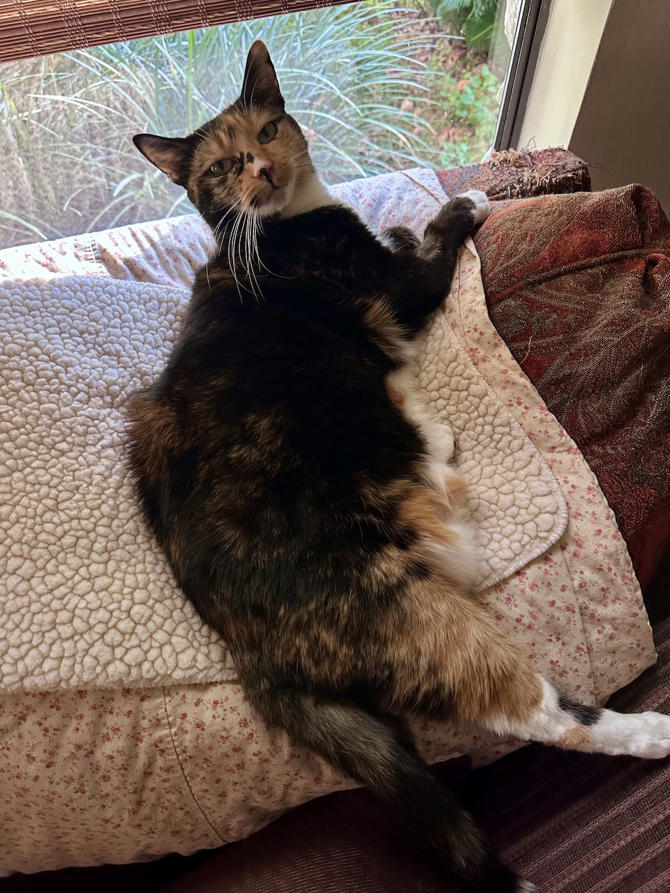 Wendy is doing quite well after our (not hers) brief scare. She’s doing all her cat things normally, including swatting at Raji now and then. [One night, when they were both gathering around my legs while I was reclined, watching TV, she swatted at Raji when he got too close. He punched her back. Seriously, he punched her. Chaos ensued.]