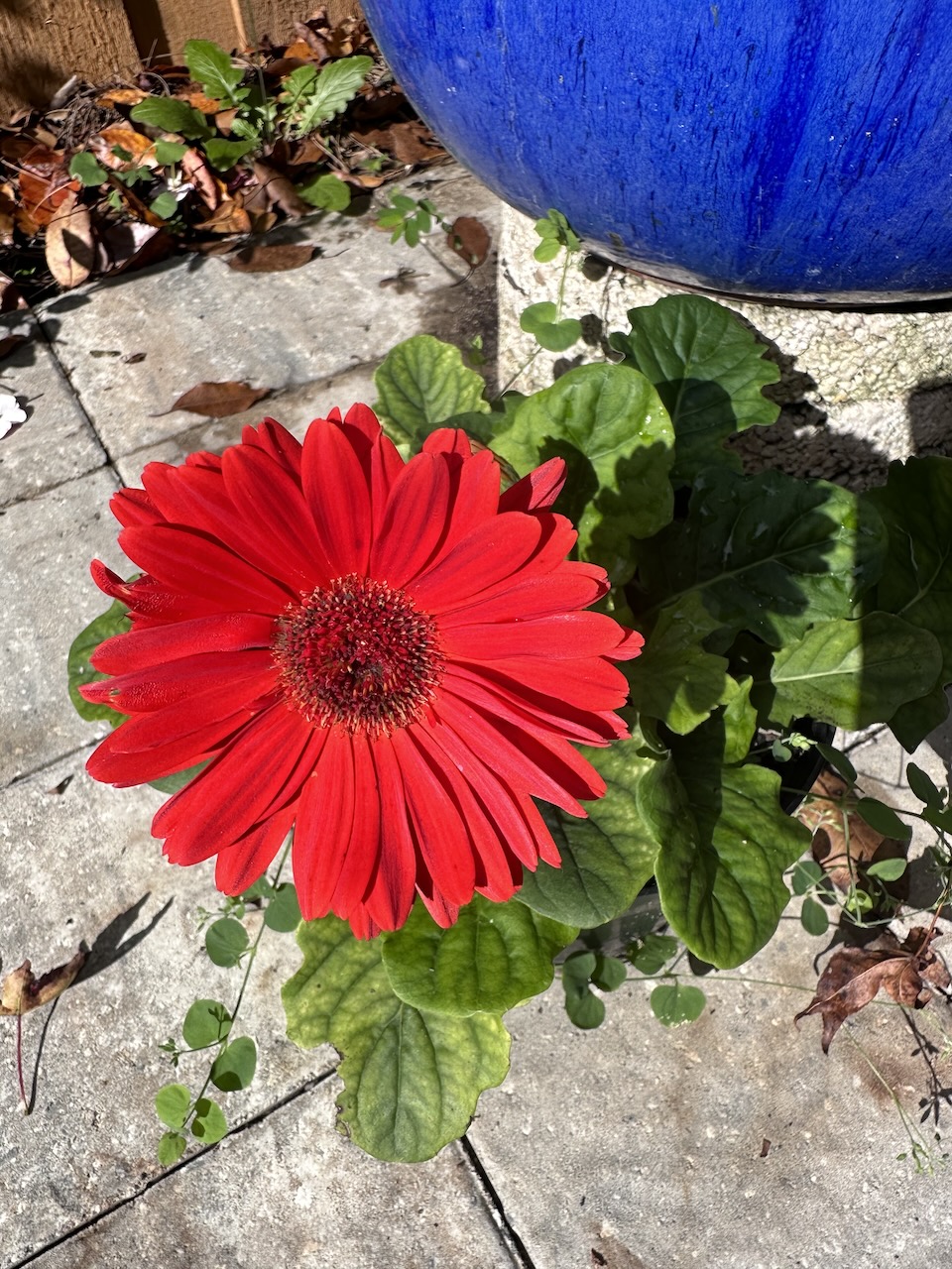 Who would not recognize a Gerbera Daisy aka Barberton Daisy (Gerbera jamesonii)? It’s another flowering plant that is flourishing on our patio.