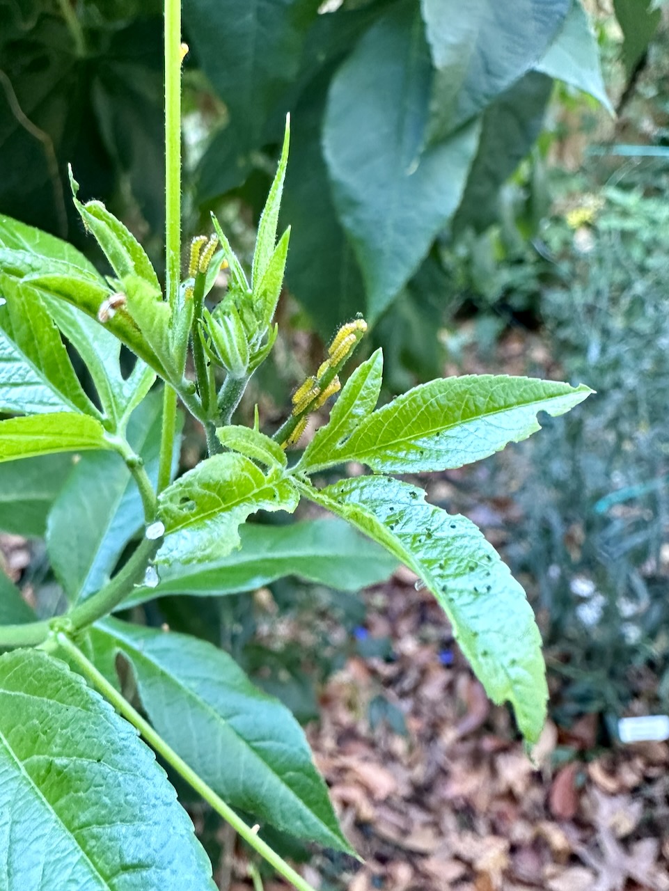 The Zebra butterflies are still making whoopee on our Passion Flower vine. I had the pleasure of watching one very delicately lay a few eggs on a stem while another butterfly flitted about, no doubt giving her encouragement. My hands were full of gardening tools so I couldn’t take any photos then. Later, I managed to get this macro shot of several eggs.