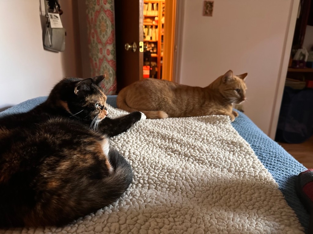 So, there we are … or here I am. I am excited about knitting all day on April 5 and for a good cause, not just my own selfish pleasure in knitting. Meanwhile, evenings are getting warmer here in north Florida so Raji’s snuggling might soon come to an end, at least for the summer.
