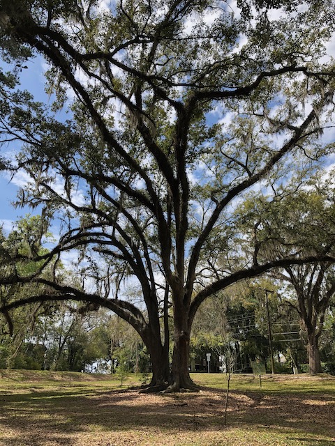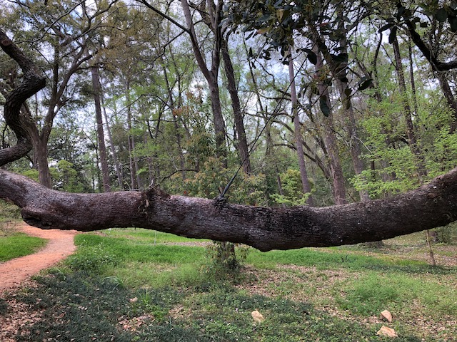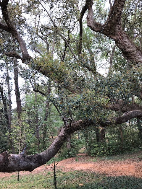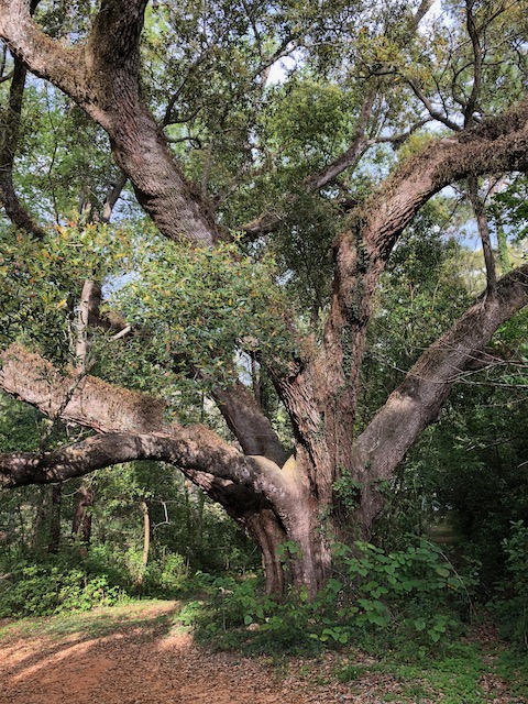 One tree I just adore. Its branches are so gnarly and arthritic-looking, we figure it must be in the 400-500 year-old range (don’t quote me). I appreciate that the park elected to tether one of its extensive, low-hanging branches to the trunk rather than lop it off. These next photos are different perspectives of the same tree.