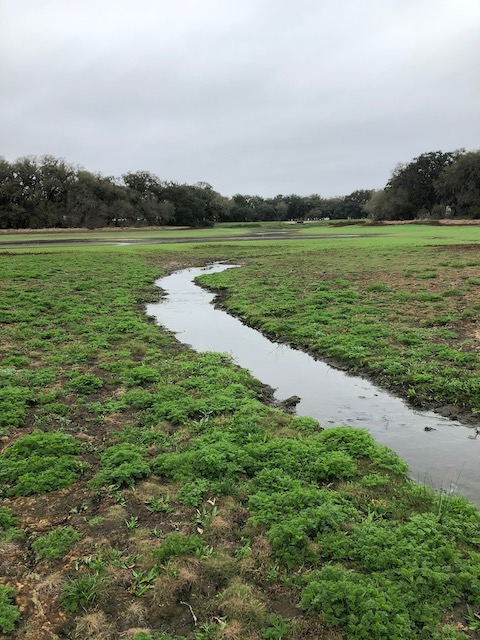 You might have to squint, but yes those are the bathing beauties (aka turtles) that I look forward to seeing on my walks around the smaller ponds. They always slip into the water when I’m on the same side of the pond as they. The third photo is of a depression that only had grassy vegetation for several weeks, until this recent rain. Now water fills Nature’s bowl. A group of wood storks enjoyed the sun on the other side of this new pond, too far away for me to get a decent photo.